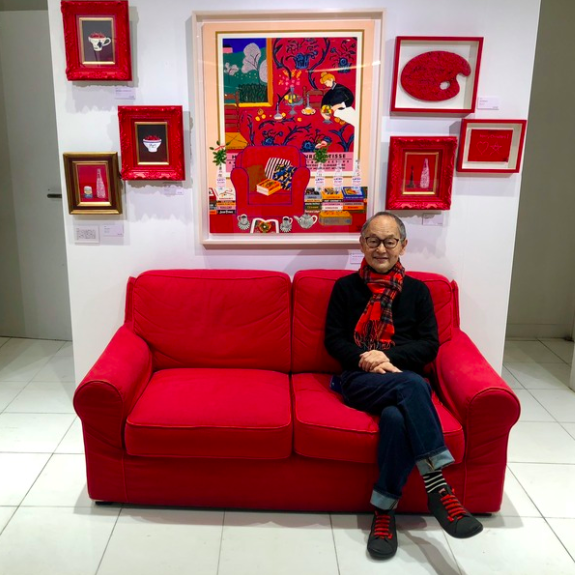 色とりどりの花、本などを描きこんだ笹尾さんの絵画は、