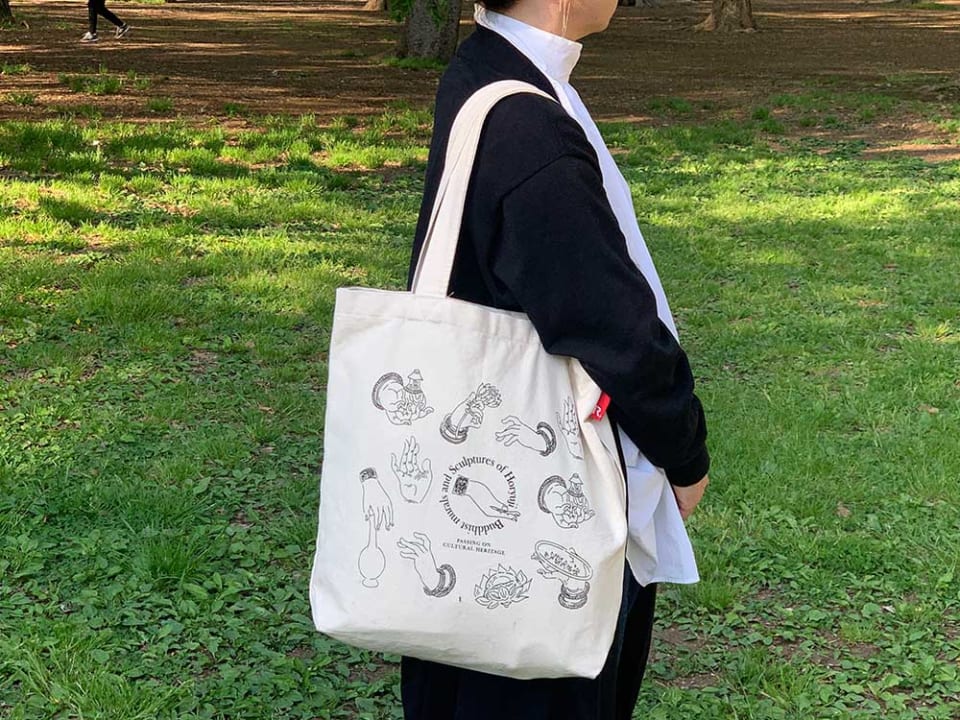 百済観音の手を描き起こしたデザインのトートバッグ。