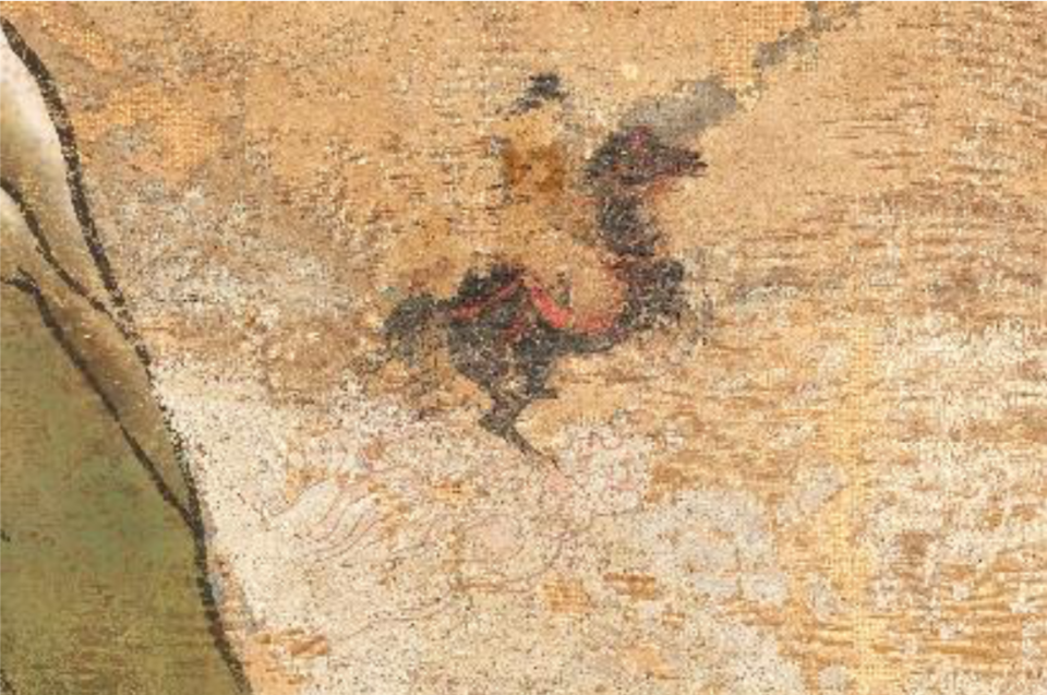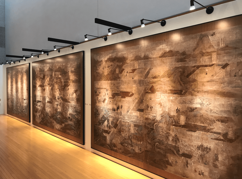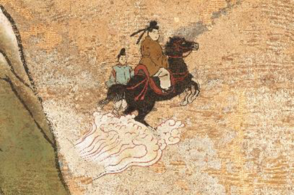 ▲国宝「聖徳太子絵伝」(太子27歳、部分)平安時代・延久元年(1069)全10面のうち第3面 東京国立博物館蔵