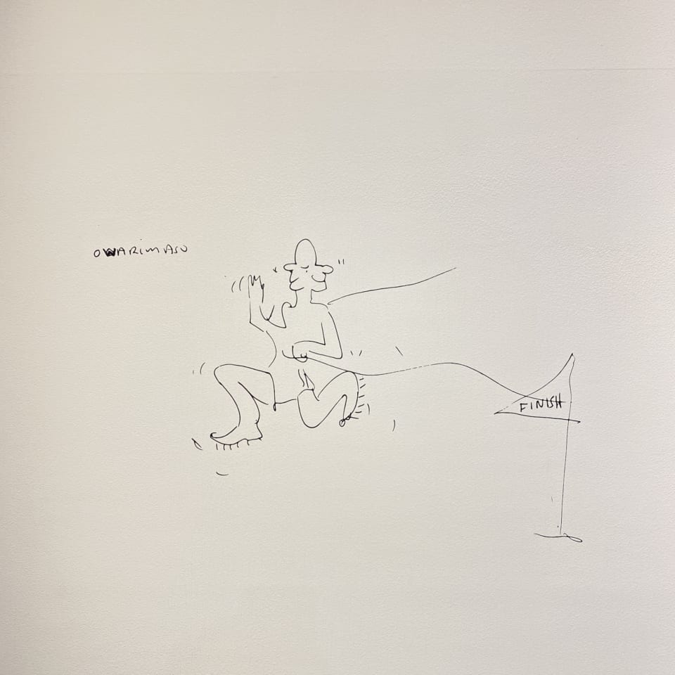 出口を教えてくれるジョンのイラスト「OWARIMASU」