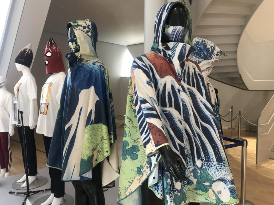 〈手前〉しりあがり寿「瀧廻りポンチョ」展示協力:株式会社ヤギ、©しりあがり寿 すみだ北斎美術館蔵(通期)