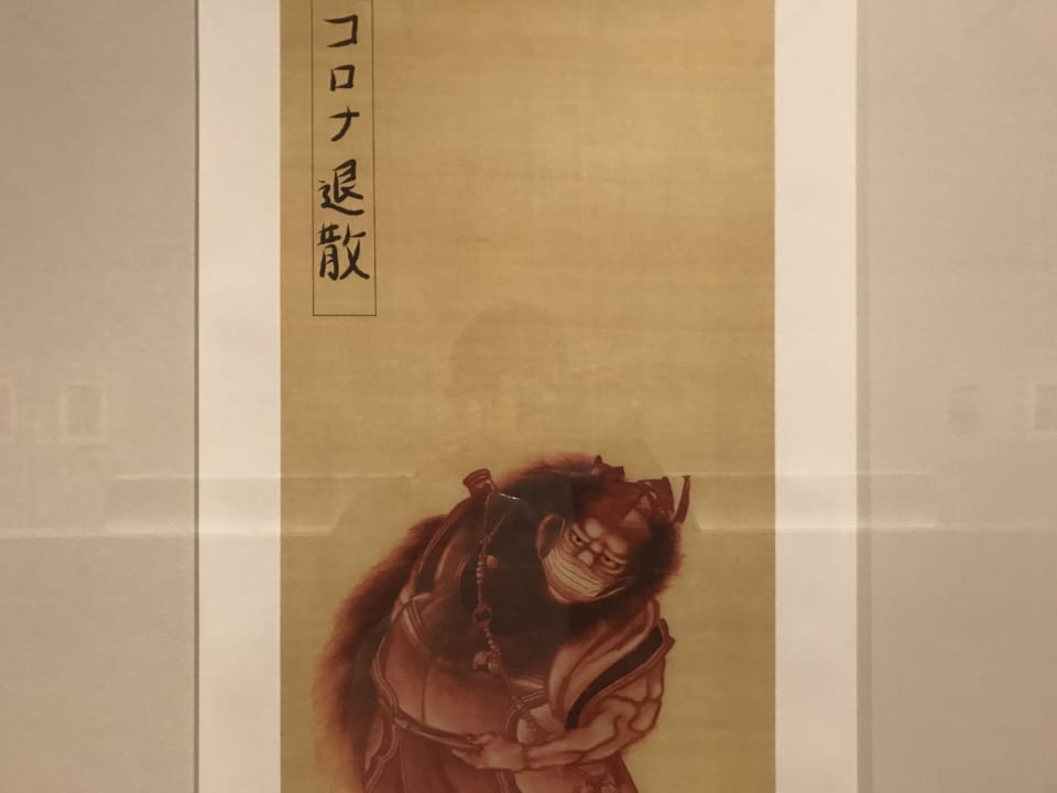 左:葛飾北斎「朱描鐘馗図」すみだ北斎美術館(前期) 右:しりあがり寿「コロナ退散 2021」©しりあがり寿 すみだ北斎美術館蔵(通期)