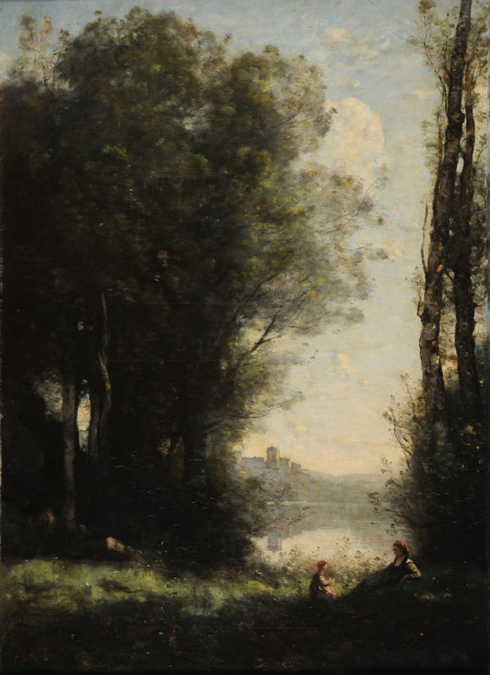 ジャン=バティスト・カミーユ・コロー (1796−1875)《湖畔の木々の下のふたりの姉妹》 1865-70年 油彩/カンヴァス 67.4×47.6 cm Inv.887.3.82 ランス美術館 © MBA Reims 2019/Photo : C.Devleeschauwer