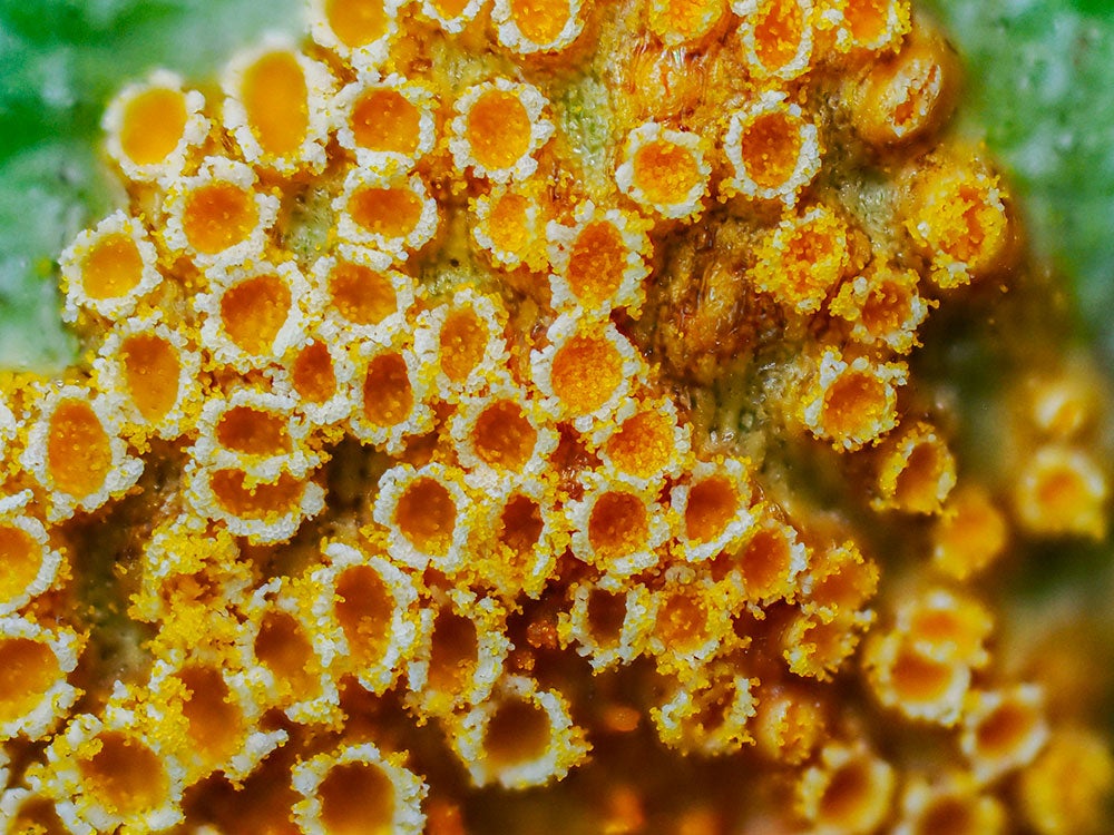 緑色の葉っぱの裏側にオレンジ色の点々が。