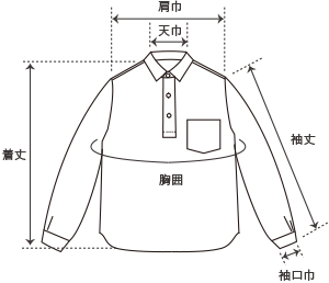 | 着丈 | 肩巾 | 胸囲 | 袖丈 | 袖口巾 | 天巾 | 前下り | |