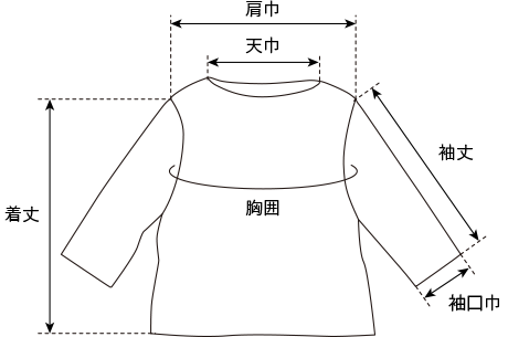| 着丈 | 肩巾 | 胸囲 | 袖丈 | 袖口巾 | 天巾 | |