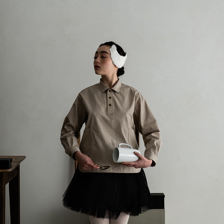 襟のかたちはアトリエコートやカバーオールと共通で、