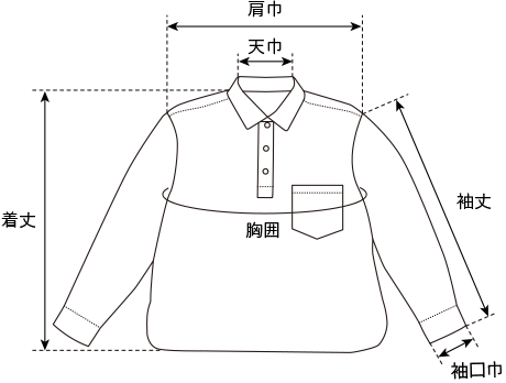 | 着丈 | 肩巾 | 胸囲 | 袖丈 | 袖口巾 | 天巾 | 前下り | |