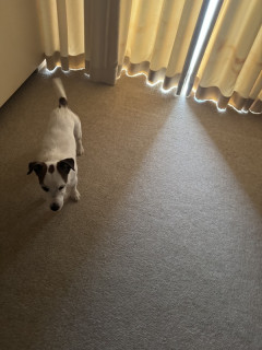 ブイコがひなたぼっこしようとカーテンの向こうに行ったので、急に光が入ってきて、おとうさんが起きました。