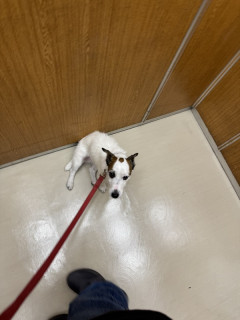 散歩の帰りのエレベーターでは、ぺたっと座ってしまう。
