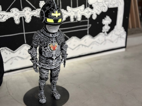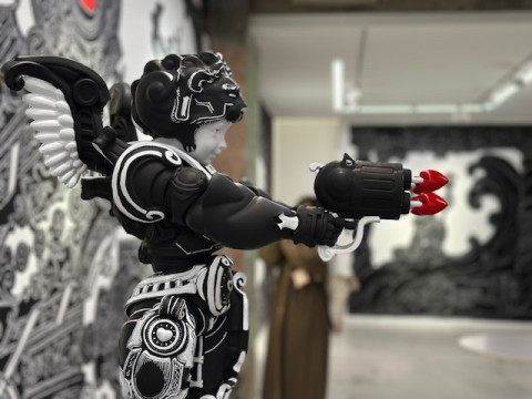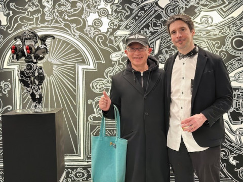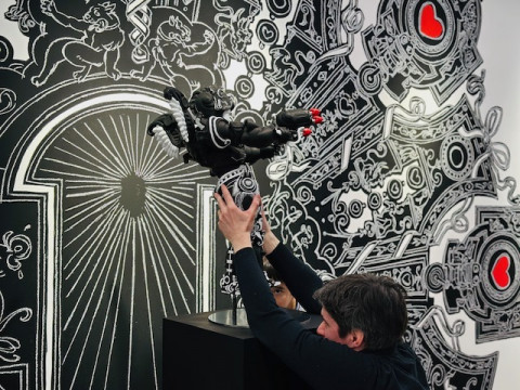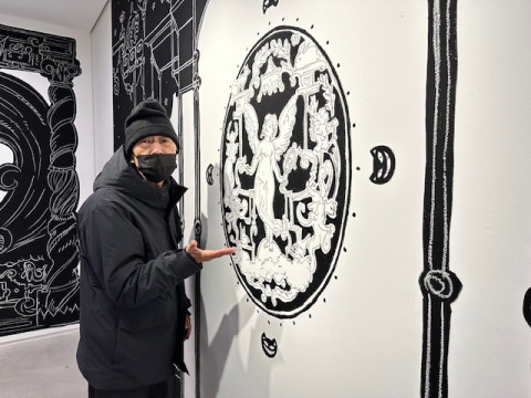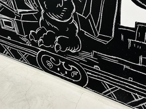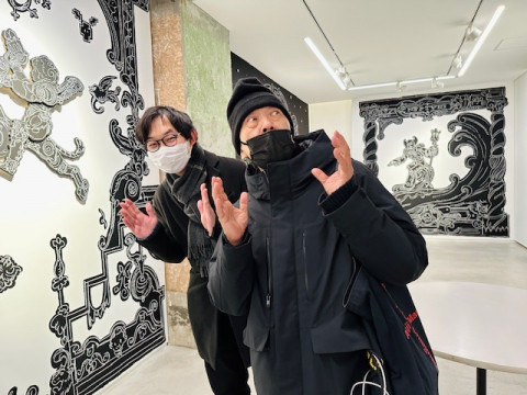ニコラ・ビュフさんの個展 いま、いっしょに本を作っているアーティストのニコラ・ビュフさんの個展が、今日から銀座のメグミオギタギャラリーで、はじまりました。 私は初日の今日、コズフィッシュの祖父江さん、坂口さんと行ってきましたよ! 会場ではニコラさんご本人が、立体物の設置をしあげているところでした。 会場にある立体物は、これから彩色をほどこして、販売もするそうです。 作品のほとんどは、ギャラリーの壁に絵の具とチョークで直接描かれています。 このメグミオギタギャラリーは、ニコラさんの個展を最後に移転するそうで、 (なんと2010年のニコラさんの展示で、このスペースははじまったのだそうです!) ビルの改築とともに絵もなくなってしまうのだそうです。 祖父江さんは4枚目の写真の女神さんを 「チョー、キュートです」 とお気に入りのようでした。 こまかい部分もすべてがよくて、ギャラリーで時間を忘れるように見ていられます。 みなさんにもぜひ見てほしい! メッチャかわいい。 祖父江さんは 「ニコラさんから生まれたかった」 と、爆弾発言をされ、ニコラさんは 「順番が‥‥」 とおっしゃっていました。 会場に、私たちほぼ日が古くからおつきあいのある八谷和彦さんのお姿を発見し、うれしくて写真を撮りました。 ニコラ・ビュフ 「キューピッドの帰還」 メグミオギタギャラリー 2025年2月21日〜3月15日12:00〜18:00 2025/02/21 19:05 |