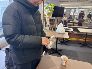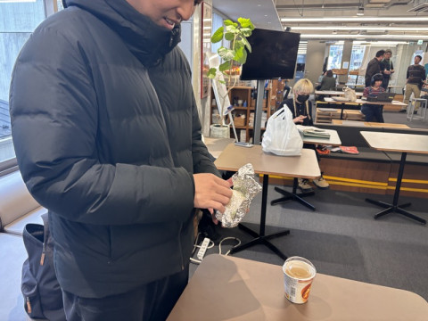 謎の銀色の玉。 落としものの多い弊社ですが、またなにか、落としものチックなものが。 謎めいた、銀色の、玉‥‥? と、多くのみなさんはきっと似たようなものに見覚えがあると思うのですが、これきっと、ピクニックとかによく持っていってた、アルミホイルにくるまれた、あれ、ですよねえ‥‥? しかし、それにしてはなにかでっかいんですよ。 ソフトボールよりも一回り大きい。 これぜんぶおにぎりなのか。 どんだけ食べるのか。 ‥‥気になってじーーっと見ていたら、 「ああ、俺のです俺のです」と 落としものじゃなかった! しかし、中身が気になります。 巨大なげんこつおにぎり? やっぱりそう? と、見ていたら、なかからサランラップに包まれたおにぎりが2つ出てきました。あ、なるほど。 枝豆入りおにぎりだそうです。 今日のお昼はこれとカップお味噌汁みたいです。 (おいしそう) その後、 人が食べてるのを見ると、同じの食べたくなりますよね。 ああ、お昼ごはん、自分もおにぎりとカップ味噌汁にしようかなあ‥‥。 2025/03/19 14:02 |