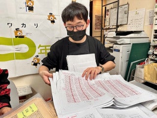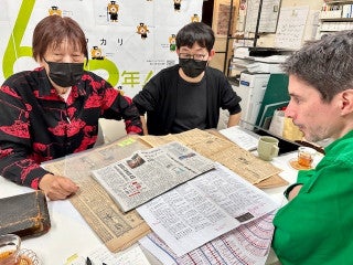 本を作っています デザイン事務所のコズフィッシュに来ています。 画家のニコラ・ビュフさんもいっしょです。 私たちは本を作っています。 1枚目の写真では新聞を机に広げていますが、作っているのは本です。 新聞の文字組がどういう変遷をたどってきたのか確かめながら、基本のレイアウトを作っているのです。 コズフィッシュの坂口さんは、このお正月をこの本の文字組の直しに捧げてくださり (ありがとうございます)、祖父江さんの10回の直しを経たそうです。 2枚目の写真はそのやり直しの束。 本がカッコよくなる過程はとても険しい。 絵を担当するニコラさんのフランス語のメモが、些細で驚くほどです。 何年もかけているので、お互いに齢を重ねています。 「尺取り虫のように進んでいるね」 と、祖父江さんはおっしゃいます。 まちがいなく進んでいます。 次の打ち合わせはゴールデンウィーク明け。 がんばります! 2025/03/26 17:46 |