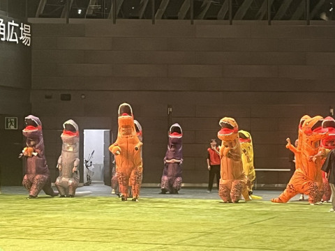 バトンタッチ代わりの肉のぬいぐるみを両手ににぎりしめているのが