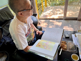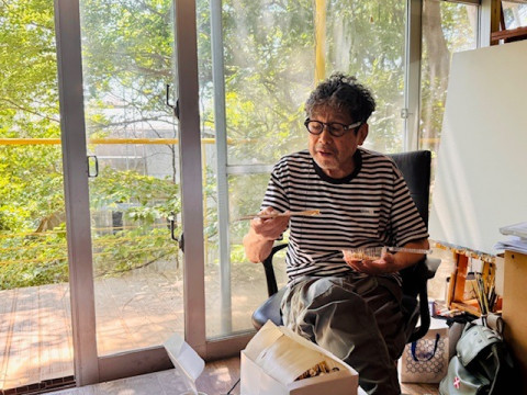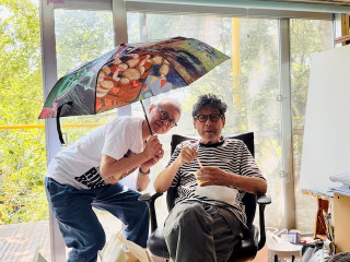 横尾さんと糸井さん 久しぶりに横尾忠則さんのアトリエに遊びにいきました。 少し前にコロナにかかってしまった横尾さんは 「まだ味覚が戻らないんだよ」 とおっしゃっていましたが、糸井の手みやげのやきそばは、食べてくださいました。 そのあと「かき氷が食べたい」ともおっしゃって、私は「横尾さんの味覚が戻ってきたのかも」と思いました。 いま、都内ではふたつの美術館で横尾さんの絵が見られます。 ひとつは世田谷美術館の 「連画の河」です。 この展覧会、3枚目の写真で糸井が持っている図録がめちゃくちゃおもしろいらしいのです (私は買わなかったので後悔しています)。 横尾さんのスケッチとしあがりの絵が対比できるようにレイアウトされていて、横尾さんの絵の、いわばすばらしい解説書となっています。 この図録を構成したのは横尾さん本人とのことで、それはもう、おもしろいにちがいない! 「連画の河」のミュージアムショップでおすすめは、1枚目の写真の傘です。 開閉自動の折りたたみ。絵が超絶クール! こんな傘持ってたら、梅雨の時期が楽しくなります。 糸井がこの日着ていったTシャツもショップで売っていました。 「連画の河」は6月22日までなので、見逃さないようにお出かけください。 もうひとつはグッチ銀座ギャラリーの 「横尾忠則 未完の自画像 - 私への旅」 です。 横尾さんの、奥さまとのツーショット展。 興味津々。こちらは8月までやっています。 2025/06/07 10:42 |