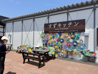 珠洲だよりその1 珠洲にやってきましたー! お天気もよくて、東京並みとはいかないまでも、真夏のような日差しで、びっくりです! 空港からの道路は、前回来た11月に比べても、さらに整備されていて、隆起している場所も、ほとんどなく、ちがう道を進んでいるんじゃないか? と思ってしまうほど。 先週、ワークショップご参加のみなさんに編んでいただき、つなげたものを、いま飾ってある部分につなげていきます。 ひと冬越えて、紫外線もたくさん浴びて、色が少しあせてきているようです。 ここにこうして、と。 シミュレーションをして、さっそくお昼ごはん。 かふぇれすとらん きへえどんさんで、今年初冷やし中華をいただきました。 野菜で麺が見えないよ! さっぱりとして、おいしかったです。 そして、二三味珈琲さんへ。 奥能登の多くの事業者さんから信頼が厚く、わたしたちもいつもお世話になっている木村さんも合流です。 今日明日2日間、お世話になります! 2025/06/18 22:03 |
