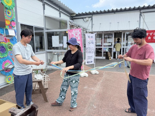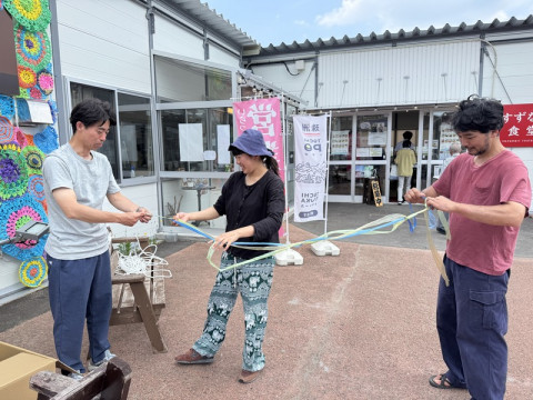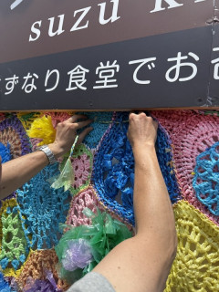 珠洲だよりその6 橋本さんだけではありません、助っ人は、すずちゃん、ひびさんという2名の若者たち。 この2人も、数ヶ月前に移住してきたそうです。 実はいま、けっこう若者の移住が増えているとか。 すずちゃん、ひびさんも、来るやいなや、みんながやっていることを見ながら、装飾をもっと華やかにする作業をどんどんしてくれました。 とりつけ作業は、誰もプロがいないので、その場で、どうやったらいいか? 考えながら、工夫します。 きゅうきょ、三つ編みをして、上と下をつなぐようにすることにしました。 うまくいくかな。 ひびのさんも時々、 「ここと、ここは、結束バンドでつないじゃって」 など、ちょっとしたアドバイスを言ってくださるのですが、それがまた、やるとすごく良くなる! その的確さったるや。 そうこうしているうちに、どんどん洗練されて、できてしまいました!(写真5枚目) ジャジャジャーーーーーーーン! 範囲が広がって、遠くから見ても、目立つようになったので、もっともっと、みんなに見てほしいです。次はもっと広げよう。 ひびのさんは、日曜日まで滞在して、ちょっと編んでは、隙間を埋めてくださるそうです。 たのしみだー。 暑い中、おつかれさまでしたー。 みなさん、すずキッチン、すずなり食堂に、ぜひ見に行ってくださいねー。 おつかれさまでした〜。 2025/06/20 00:13 |