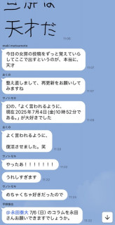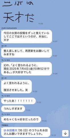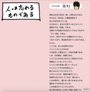 『N田の大失態を救え!』 異変に気づいたのは、読みものチームの稲崎だった。 毎日、毎日、ほぼ日の 「読みもの・観るもの」ページの冒頭を飾っている、日替わりの 「ほぼ日3分間コラム」。 読みものチームのメンバーが毎日執筆を担当しているのだが、2025年7月4日、更新直前だが原稿が登録されてない。 じつに、更新17分前。 担当は、老兵、N田。 どうやらやっちまったらしい。 さあ、どうする? その瞬間から、読みものチームのメンバーが連絡用につかっているメッセージルームでは、 「この危機をどう脱するのか?」 という緊急対策がはじまった。 添付した画像は、その生々しいやりとりのスクショである。 すばらしい後輩たちの対応に、N田は深く感謝した。午後3時ごろに。 2025/07/04 18:32 |
