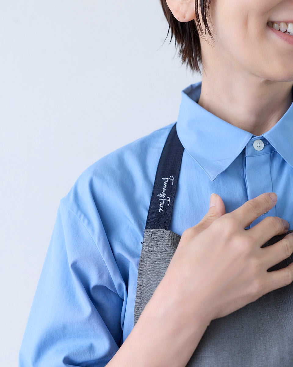緑のトップスに「POWDER BLOOM」のエプロンは、