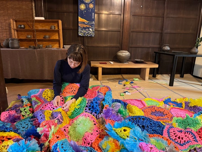 「珠洲の食堂をカラフルな編み物で包む」という試み。