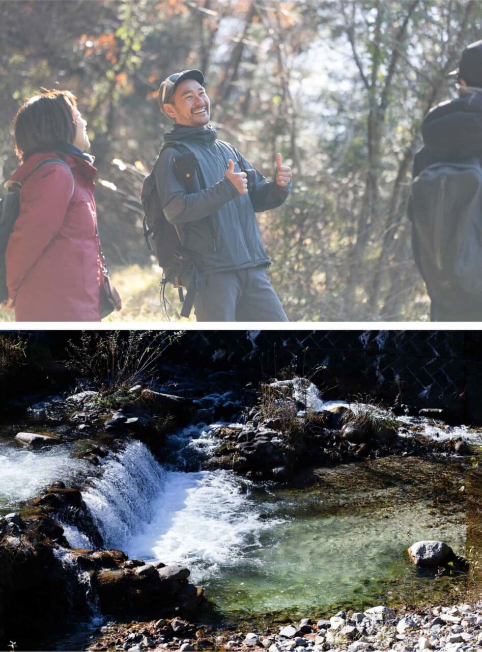 ▲水面がエメラルドグリーンに輝く渓流沿いを、束の間のハイキング。