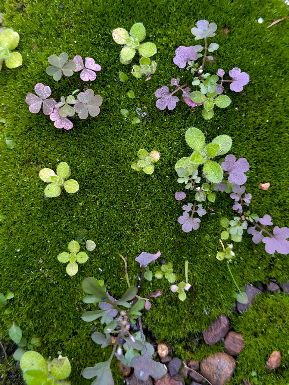 苔の上に雑草(カタバミ、ハコベ、タネツケバナ?)の