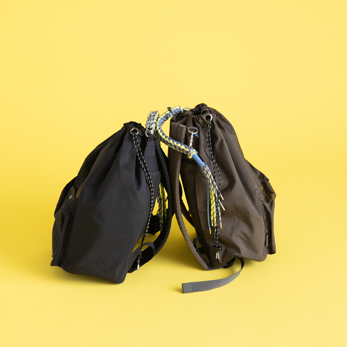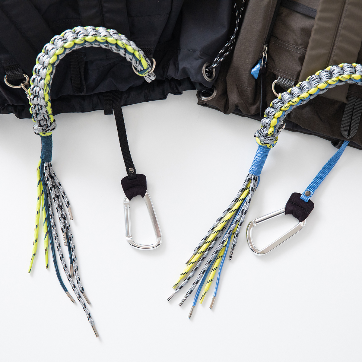 3色のハンドルと大きなカラビナなど