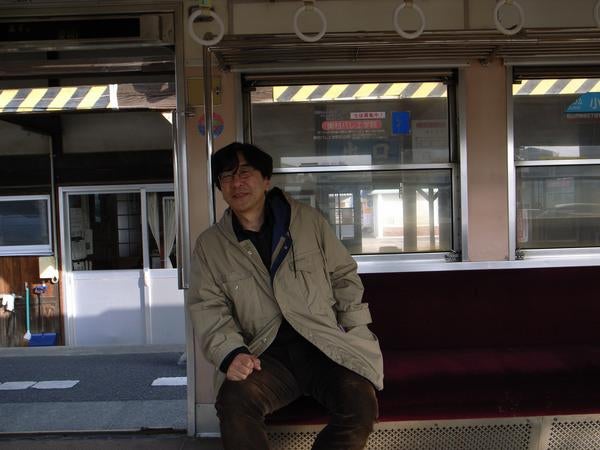 二両編成の電車に乗る中沢新一先生。
