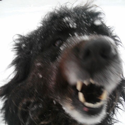 雪景色と、走る大きな犬。