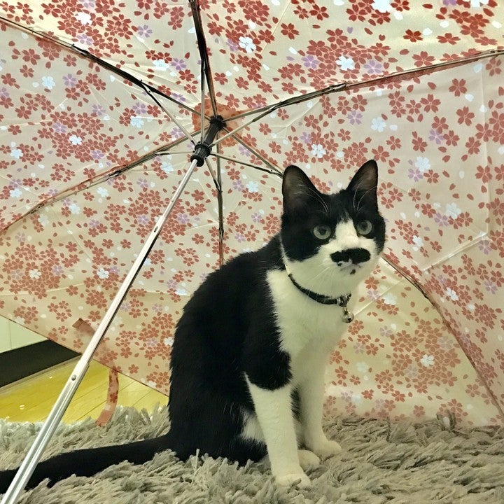 花柄の傘を背景に決めポーズ。