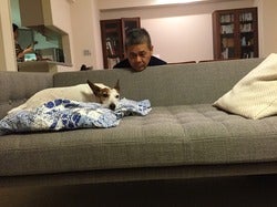 あわててソファの後ろに移動します。