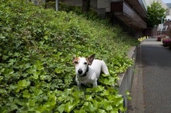 ちょっと高いところに犬を乗せて、
