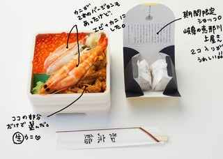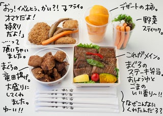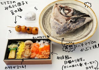 どのお弁当もみんな美味しそうでしたが、 田口さんのが一番食べてみたい! かぶと焼きっていうだけでも、 見た目のインパクト大なのに、 天然もの! 特別なもの! という、 おいしさを誘うキーワードがいっぱい! こんなの見た事無い! そして、それにあわせたお弁当。これが良いです! カニにほたて、サーモン! こんなに豪華でボリューム満点なのに680円て‥‥! なんてリーズナブルなの?! しかもデザートがお団子と大福だなんて‥‥。 私の大好物だ‥‥。 隙がない‥‥隙がなさすぎです。 極めつけは、値段が2000円ぴったりという! 完璧ですね! (たけけし)