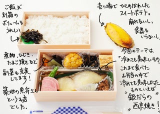 田口さんのお弁当を見て、 私は実家の夕食を思い出しました。 かぶと焼きがそうなのではなく、 絵面全体のアンバランスさ、というか 「食べたい物を買ったらこうなった」的なベクトルが 他のみなさんよりもずば抜けて、 ナナメ上を行っていて、 それがうちの実家の食卓と似ていたからです。 なんだか懐かしい気持ちがこみあげました。 学校で「きのう食べたごはんを発表してください」と 先生が課題をだし、私はそのまんまを書いたのです。 ・カレーライス ・かつおの刺身 ・野菜炒め ・みそ汁 ・煮物、でした。 私はおかしいとは思わなかったのですが、 みんなに「おかしいよ」と。 まぐろのかぶと焼きのとなりに、 だんごと大福が置いてあるあたりが まさに、うちの実家めし。 田口さんのお弁当、私はすきです。 (ひろこっぴ)
