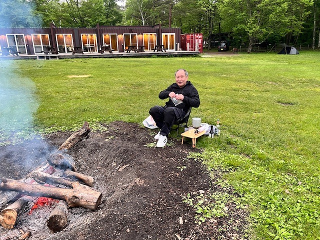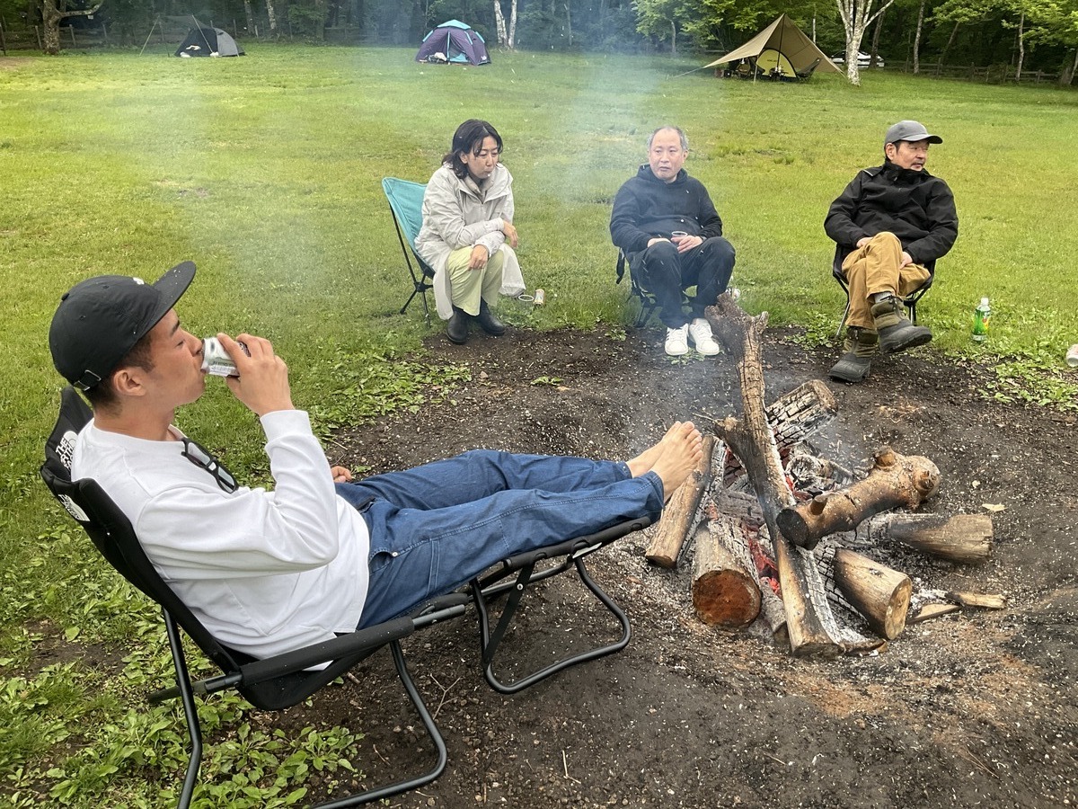 粕谷さんは焚き火のそばで、