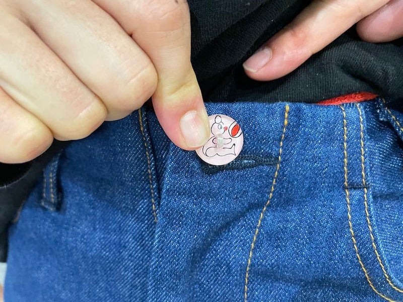 ボタンを見せながら歩かないと。