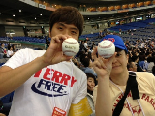 練習見学中の特別サービス。試合で使う公式球と、ジャイアンツの練習用のボールをみんなの手元に回しています。ちなみにこれは、糸井のアイデア。野球ファンほど、しみじみうれしい。