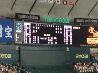 東京ドームにつきましたー!「ゴーゴー レッツゴー!」みたいな応援がすごいです!わたしは今日、手帳のページにあるダウンロードシティの「スコアボード風メモ」を貼り付けて、やる気満々でまいりました!さっそく、書き始めることにします!…あれ、選手名って、どうやって書くんでしょう。このメモは1から順に書いてあるけど、実際のスコアボードは守備の番号になってるからから、数字がバラバラだ!!うーん、とりあえず、スコアボードを写真にとっておくことにします。