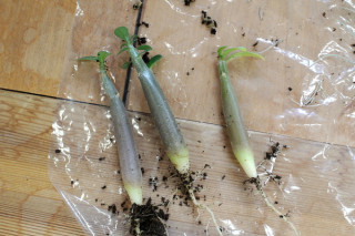 以前からやろうやろう、 いつやるの、今じゃないでしょ、と ふたりのスケジュールが合わずに 先延ばしにしてきた 砂漠のバラの株分けを いよいよ今日、決行いたしました。