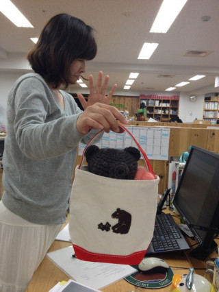 わが社の は ランチバックに、こぐまちゃんつきの クマ親子をつけていました。 机に飾っていたくまのあみぐるみを入れて 「Wクマ」、だそうです。 |