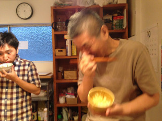 さきほどの、キッチンゴハン続編です。あのあと、我々はツリーハウスの打ち合わせを終え、ごはんタイムに突入しました。次回のうまけりゃうれるべ市。のための準備なのですが、時間帯もよろしく、とてもおいしく、ゴハンを食べました。は自分で考えだした食べあわせがあまりにおいしすぎて吹き出したり、食べようとしている人をわざと吹き出させたりしています。ちょっと目を離したすきにおもいっきりおいしい顔も、しておりました。(写真3枚目)次のうれるべ市は、11月初旬かなぁ、と思っています。おたのしみに〜。