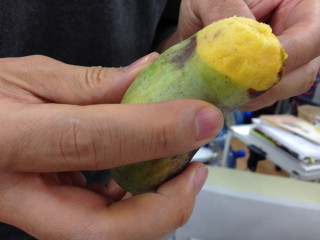 ぱっと見、焼き芋のようなそのポポーは、 とてもやわらかく、 バナナのような、パパイヤのような、 あっさりしたマンゴーのような、 日本じゃない甘さなのだけれども そんなに重くない、 というやさしい味がしました。