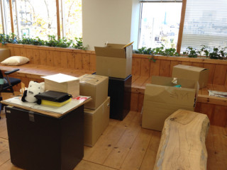 まだ縁側に段ボールや引き出しを