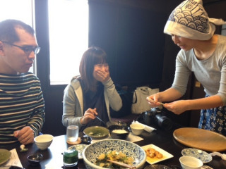さん、さん、さんがいらっしゃいました!まずはばっぱの台所でご飯です。旬のタケノコの煮物、震災後今日初めて作られたというホヤのオリーブオイル漬け、そして海鮮丼とどれもおいしいです。わたしはいつもこういうおいしい現場に立ち会えてありがたいです。食事を終えまして、これから撮影をおこないますー!
