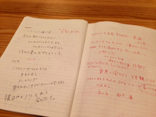 その際、なにか、得意気に 水色のものを掲げられたので それは何かとたずねてみたら、 取材ノートでした。