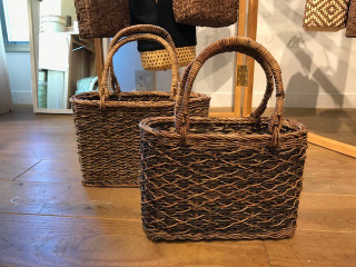 それから、またたびとぶどうの蔓の ダイヤ柄のバッグに驚きました。 (写真後ろの白×茶のバッグ) まず、お値段にびっくりーーー。 そして、細工や編み目の丁寧さ、こまやかさ、 上品なつやのよさにも驚きました。 持ったときにふわっと軽いことも驚きでした。 こういう立派なバッグに 気軽に触れられる機会があることが おもしろいなあと思いました。