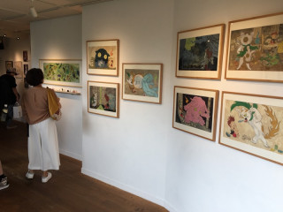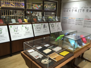 透明なケースの中に展示してあるのは、 昨年までのほぼ日手帳カバー。 香港のみなさんに ほぼ日手帳のことをよく知ってもらうために、 これまでのあゆみをまとめたパネルも 作っていただきました(正面壁面)。
