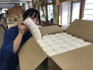さて、 が のぞいている ダンボールに入っているものは なにかと申しますと、 カップです。