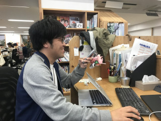 が、 あれ? あれ? と、 不穏な疑問形を連発していました。 くわしく聞いてみると 「俺の机のうえの 子機が行方不明なんです。」 なるほど。 電話貸しましょうか? 「あ、ありがとうございます。」 ちなみに、そのぶら下がっている ピンクのやつは 上野動物園に仕事にいったときに 購入してきた ハダカデバネズミのキーホルダーです。 緊迫した電話をしているときに 周囲に緊張を走らせないための 気遣いの気持ちです。 それはさておき、よくあることとしては、 自分のキャビネットの引き出しにしまって 行方不明というやつですが 確認したところそこにも子機は ありませんでした。