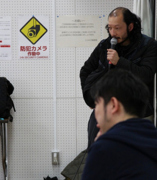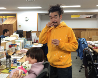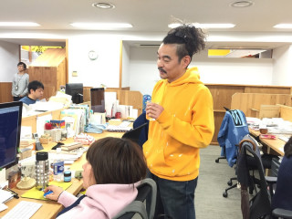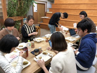 ひな壇の前の広いスペースで、 ほぼ日手帳の製作チームが みんなでカレーを食べながら わいわいと打ち合わせをしていました。